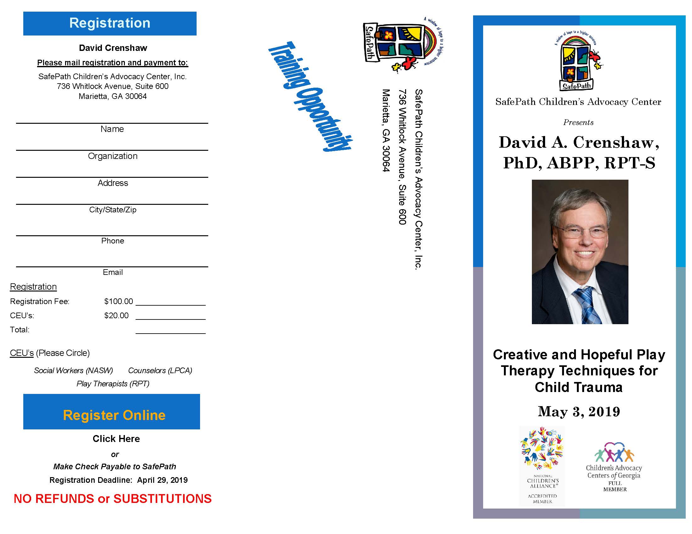 Dr. David A. Crenshaw presents "Creative and Hopeful Play Therapy Techniques for Child Trauma" - Some play therapy theoretical approaches such as Child-Centered Play Therapy (CCPT) and Jungian Analytical Play Therapy (JAPT) honor and respect the innate healing potential of a child and are inherently hopeful in the treatment of child trauma even though the approaches differ greatly in methods. In addition, there are interventions and specific techniques that are trans-theoretical that can be integrated into a wide range of theoretical models that focus on the strengths and resilience of children and families, including spiritual resources that will be featured in this day-long workshop. The presenter places primary emphasis on the common variables in play therapy, our way of being with a child in an unguarded, receptive, nonjudgmental, accepting, and fully present manner. In addition to our way of being and therapeutic presence that are the primary healing factors, specific strategies will be shared in this workshop to facilitate resilience in play therapy, to enhance hope, spiritual, and creative potentials. RSVP is required for this event. For more information, please contact Ms. Vicky Spann at (770) 801-3465 or at [email protected].